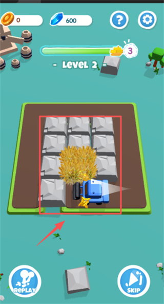 4、每个关卡需完成运输车与草堆的特定收割目标,过程中可随时使用左下角REPLAY重新挑战,或通过右下角SKIP跳关功能切换关卡。