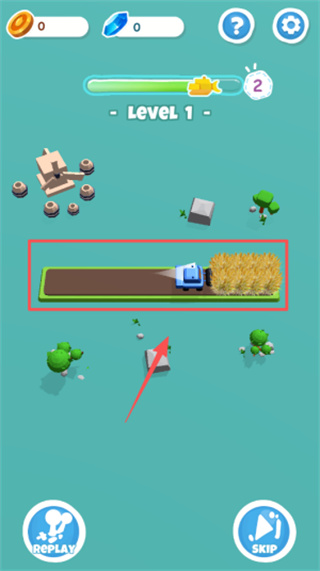 2、关卡进行中可通过左下角蓝色REPLAY重玩按钮重置进度,或使用右下角红色SKIP跳过本关,同时要注意完成收割蓝色卡车周围麦田的核心任务。
