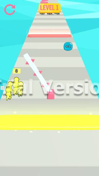 2、触摸屏幕左右两侧来控制果冻人横向移动,躲避障碍物。尽可能多地收集赛道上的道具,壮大自身队伍实力。