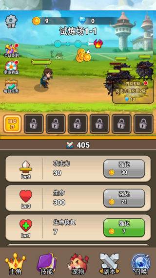 1、随着角色能力提升,你可以升级“试炼场”的等级,从而提升每次自动打怪获得的资源数量。