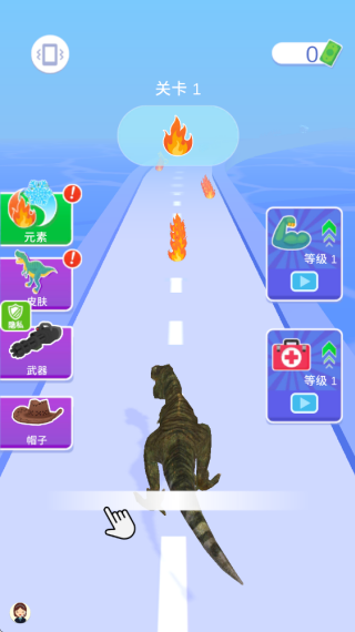 2.核心目标:玩家操控恐龙在关卡中前进,通过收集元素强化属性,并在终点与BOSS展开战斗,最终以元素积累量决定胜负概率。