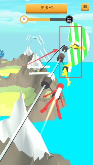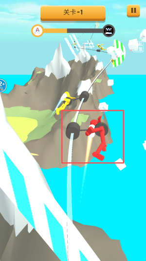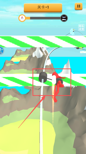 3、让红色小人抓住绳索往上爬,注意避开旁边的螺旋桨障碍,爬得越高得分就越多。