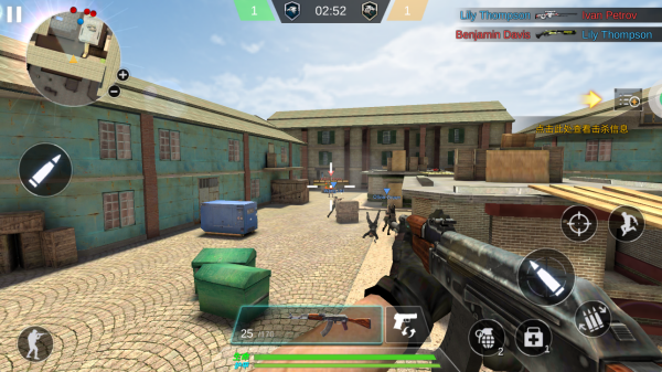 3、采用虚拟摇杆控制角色移动,右侧按键操作射击与战术动作。