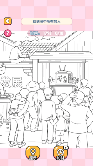 2.在怀旧蹭电视关卡中,玩家的任务是要找到图中的所有人,十分考考验观察力。