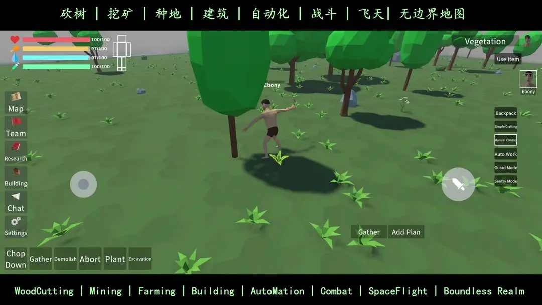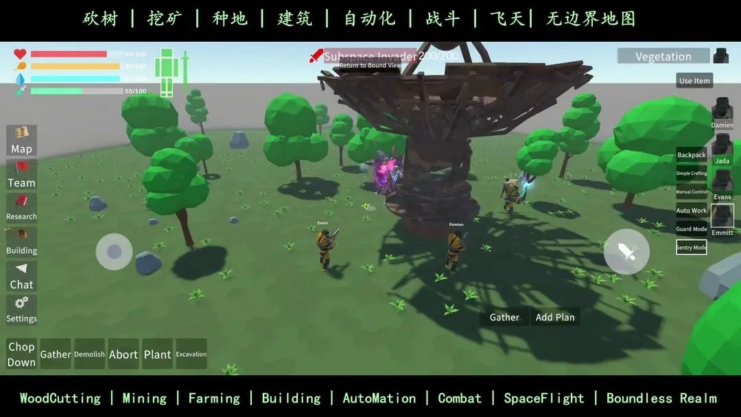 没有小地图,大地图也没什么用,跑着跑着都不知道自己跑哪里去了,地图上资源点也没有标记。怪物随机刷新,好不容易花了1000招募的工人被野怪打死了,工人就傻傻在那站着也不攻击。这野怪还能远程攻击这么远,关键是我还裸装,遇到野怪只能跑。没有新手教程,好多操作不清楚,全靠自己摸索。怎么让工人自动挖矿砍树,怎么让他吃东西,然后就这么饿死了。自动工作也不能自动拾取,还要我一个个捡。