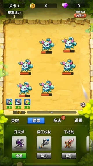1.游戏中的玩法非常的简单,操作上也是对于玩家没有任何的要求,以放置挂机玩法为基础,玩家要轻松的开启战斗并体验各种随机属性的武器,你还要在不断的强化过程中获得属性超强的武器,设计了强力的装备,这些强力的装备能瞬间提升人物的实力,你还要帮助角色打败不断变强的敌人。