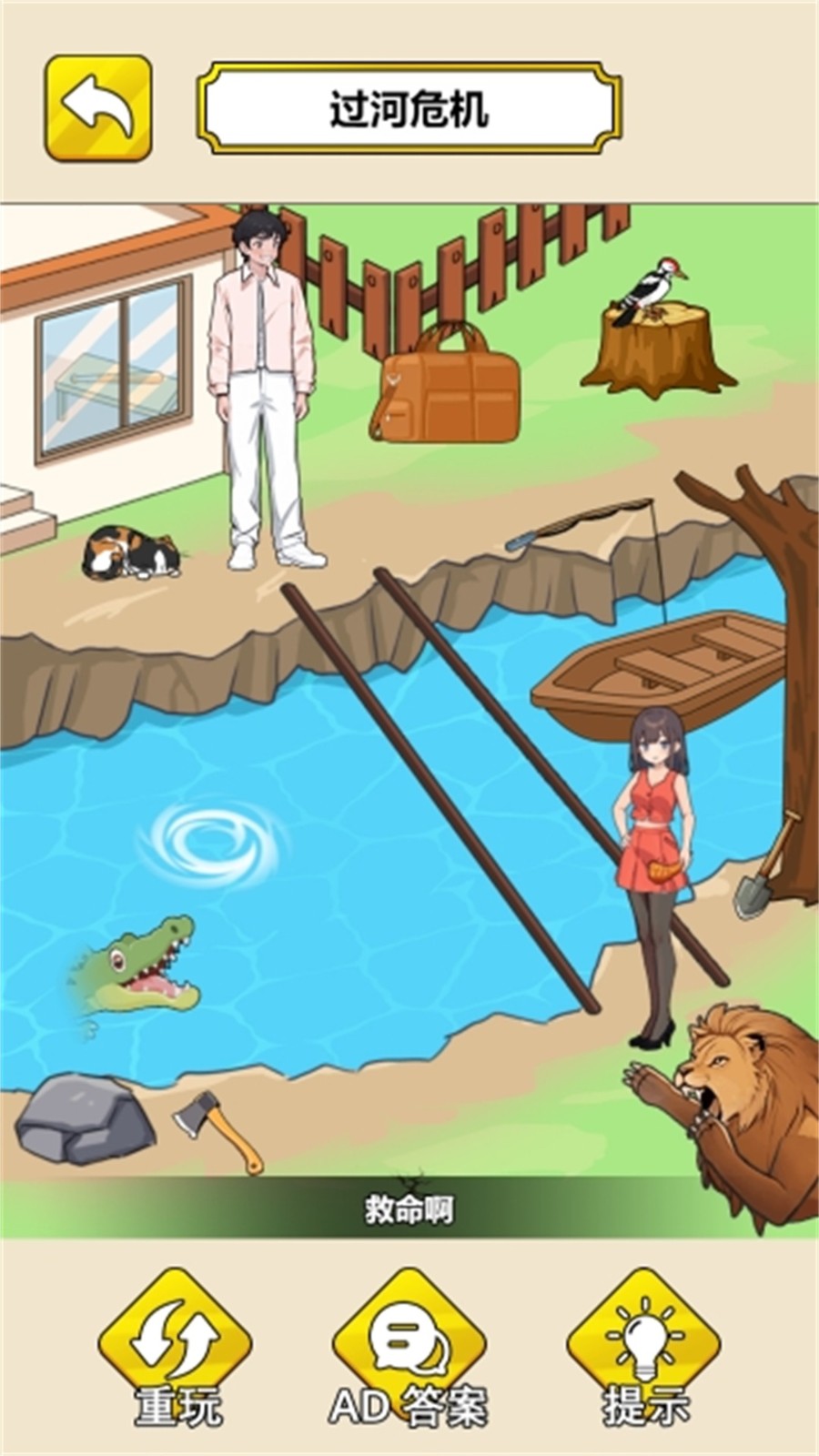 3、在过河危机关卡中,需要合理使用场景当中的物品来完成挑战。