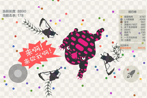 在游戏的的操作上,五毒大作战正版可以说是非常简单的,其运用的是时下最常见的操作方式,由玩家控制左下方的虚拟摇杆进行移动,通过吞噬屏幕中四散的食物来让自己变的更长。此外,五毒大作战正版中大量的"毒虫"皮肤随你选择,其中各个不同毒虫都也都赋予了天然的特性,玩家们可根据自己的兴趣爱好进行穿戴,使得游戏过程更具有趣味性。总的来说,游戏虽然没有过于惊艳的画面,但是它魔性的“重口味”带给大家别样的乐趣,相信玩家们会在这款游戏中体验不一样的精彩乐趣,快来下载体验吧。
