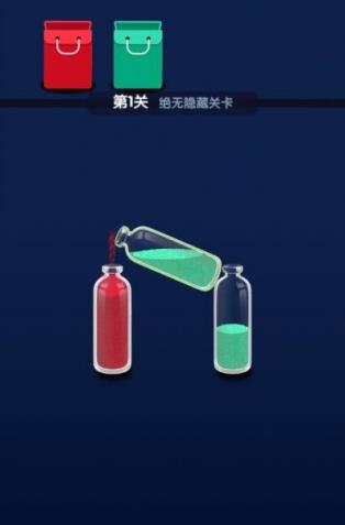 2、观察瓶中沙子颜色,优先将同色沙子倒入对应容器。如绿色沙子可倒入绿色容器,红色沙子倒入红色容器,通过精准分类完成关卡。