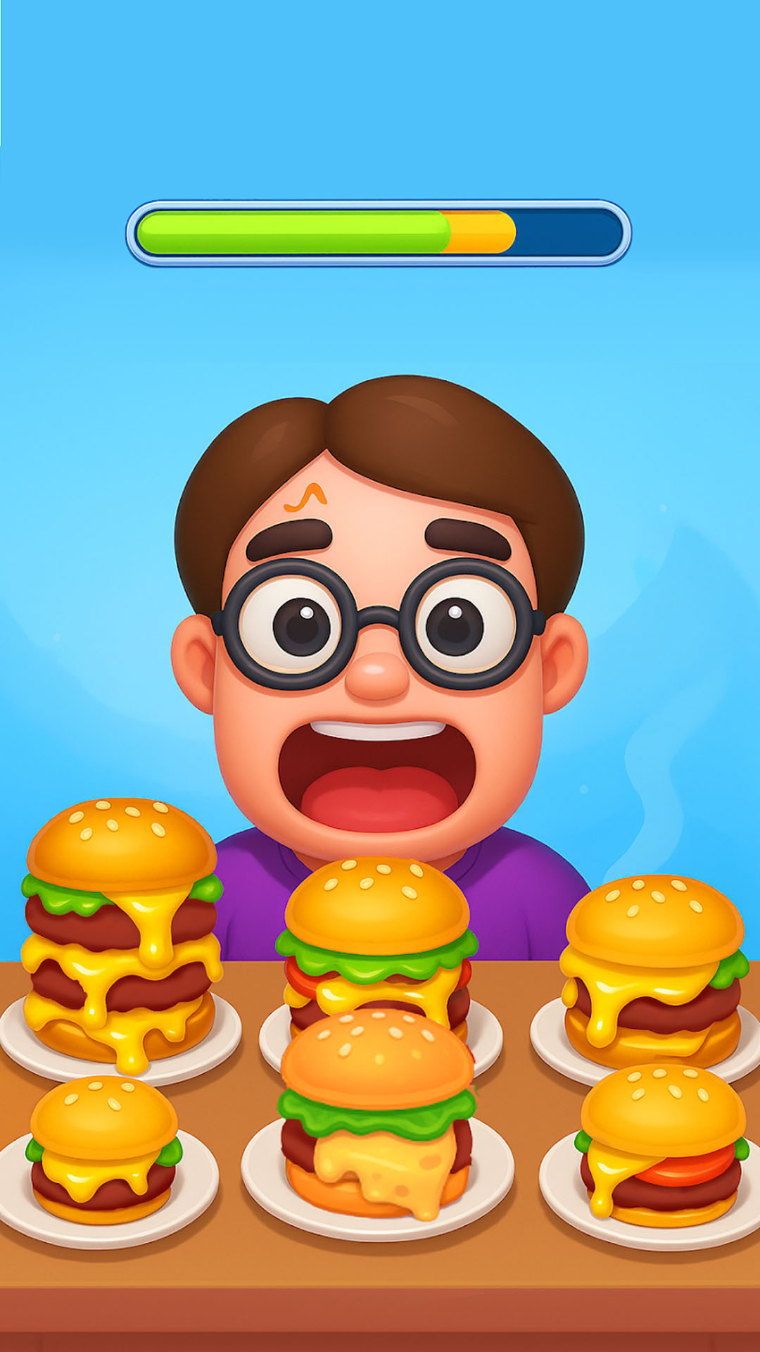 2、收集到的食材会自动进行堆叠,不断的变成完整的汉堡。