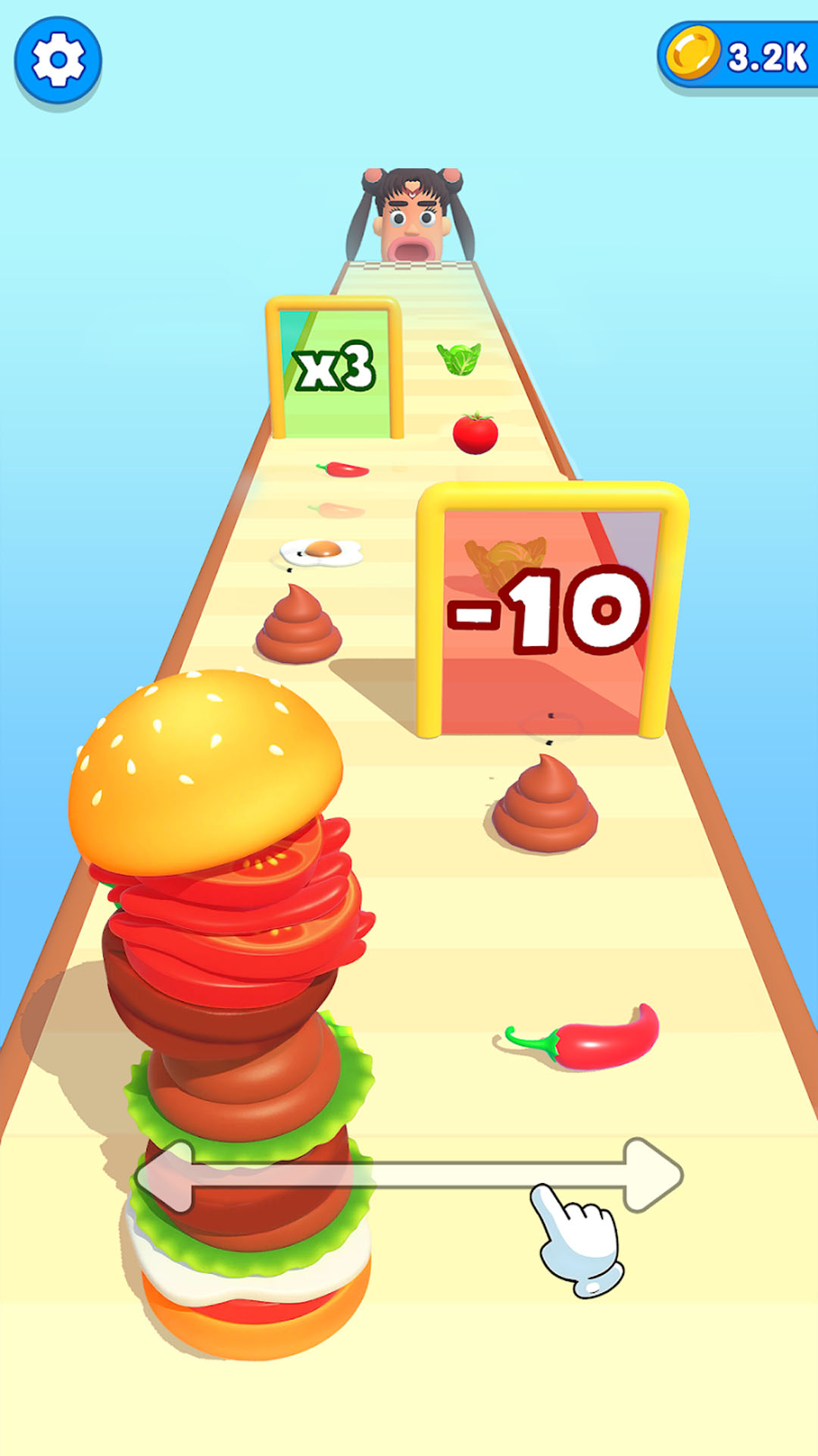 1、操控角色在赛道上奔跑,途中需精准收集散落的新鲜食材,避免遗漏关键配料,为后续打造汉堡储备充足素材。