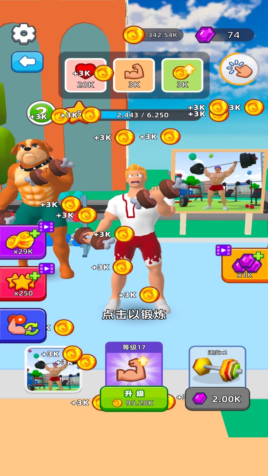 1、通过快速点击屏幕完成俯卧撑训练,每次触控可获得10-50枚随机金币奖励。
