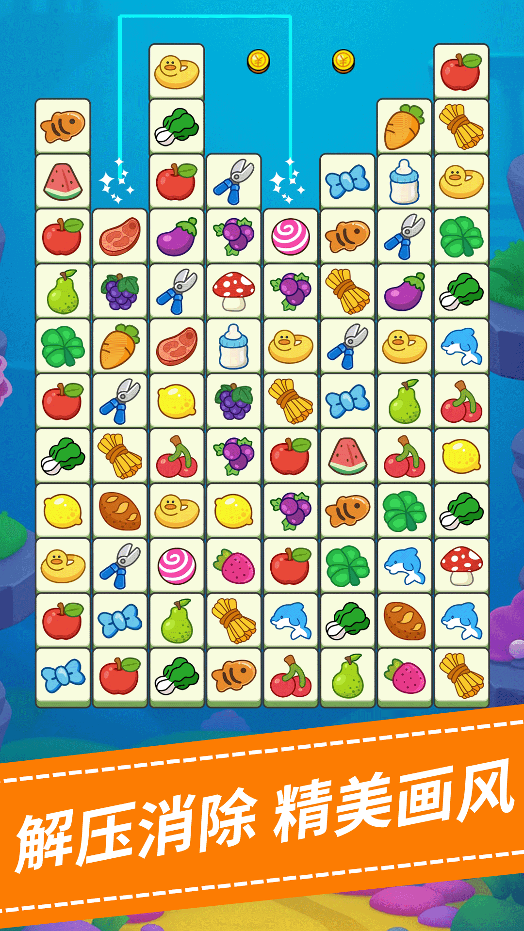 1、点击两个相同水果图标即可完成消除,相邻或斜向连接均有效。