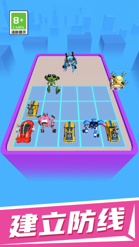 1、通过拖拽操作将三个相同低级机器人合并,升级为更强大的高级兵种。