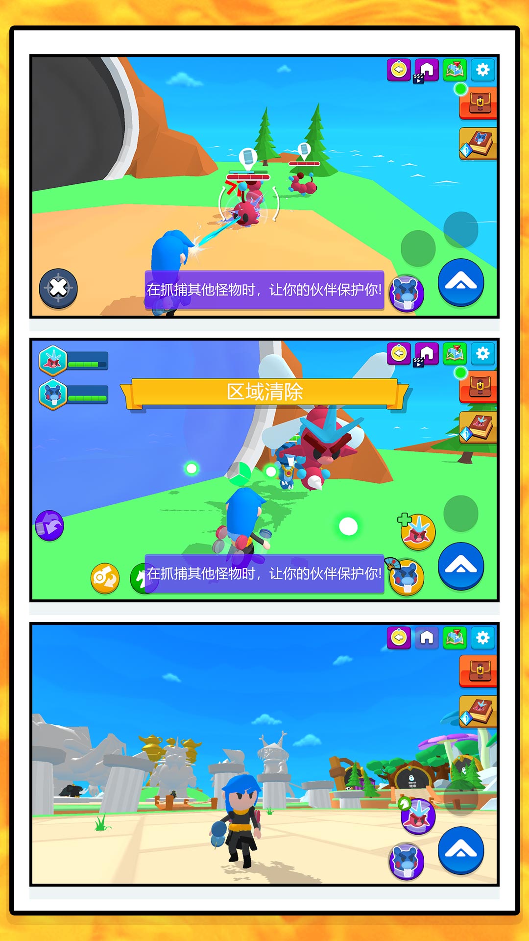 1、进入高难度关卡,指挥伙伴在抓捕怪物时提供保护,应对数量增多的敌人,同时通过战斗提升精灵等级,解锁更强技能。