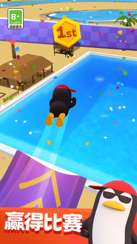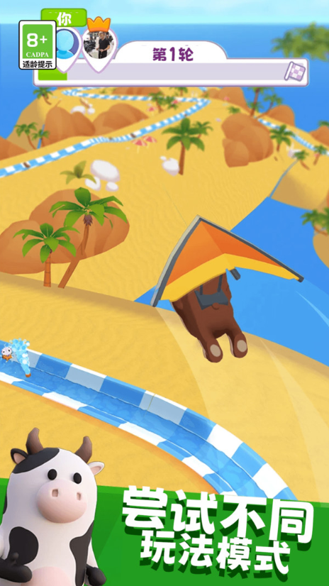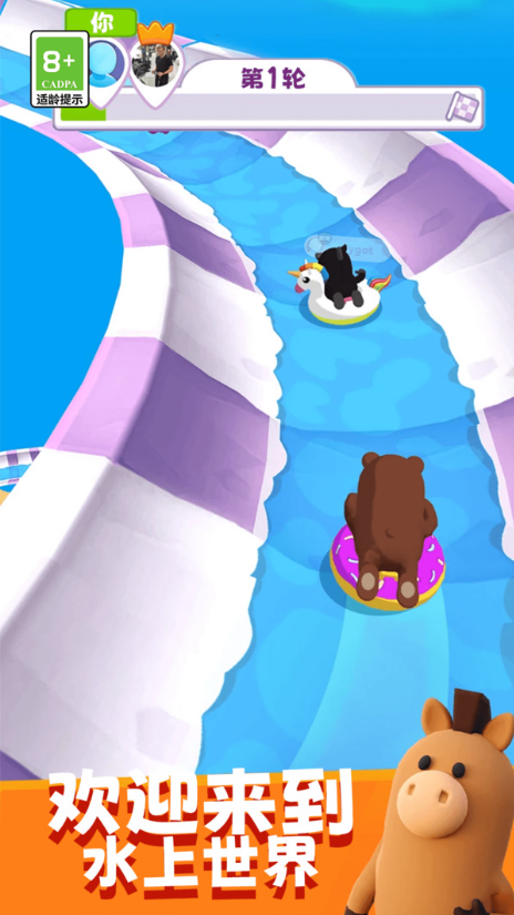 1、进入游戏后,玩家首先选择喜欢的卡通角色并进入水上滑道,通过左右滑动屏幕控制角色移动,避开弯道处的障碍物并尝试收集加速道具。