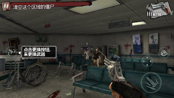 1、采用俯视角射击操作,通过虚拟摇杆控制移动与射击方向,灵活应对来自四面八方的僵尸围攻。