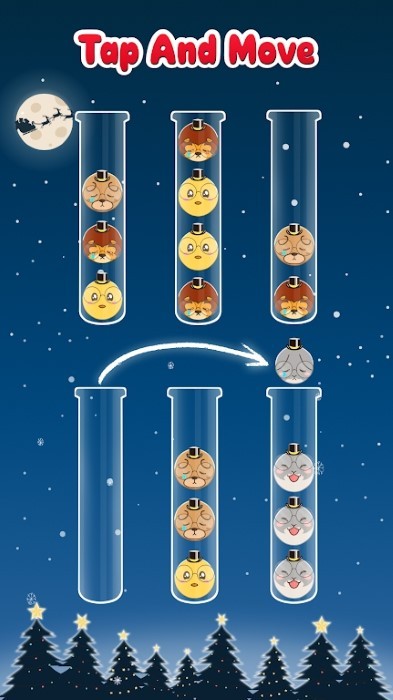 2、操作以球的移动为重点,通过点击选中管道,将其顶部的宠物球移动到另一管道顶部,只有当目标管道的顶部球类型与移动球相同时才能成功放置。