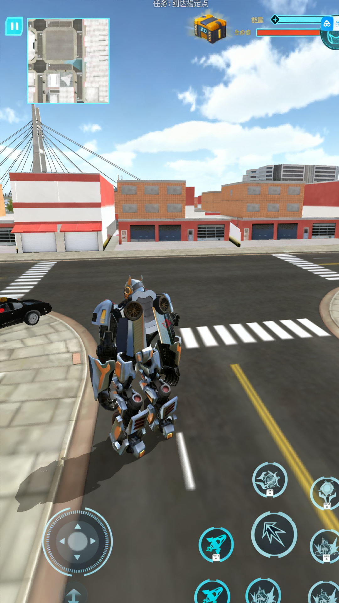 2、驾驶机甲在都市战场自由移动,探索不同区域。