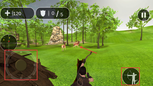 3、操作左侧虚拟摇杆控制角色移动,右侧按键负责瞄准与拉弓。