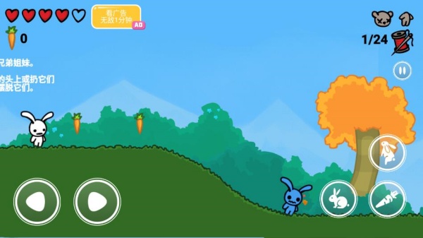 4、优先收集场景中的胡萝卜,同时留意蓝色兔子等可互动角色,利用右侧操作按钮灵活切换角色,通过协作获取更多资源,推进关卡进度。