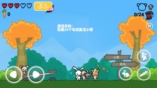 2、明确游戏目标是收集24个毛线复活小熊,沿着场景中的路标前进,与兔子、小熊、小鹿等角色互动,逐步收集毛线。