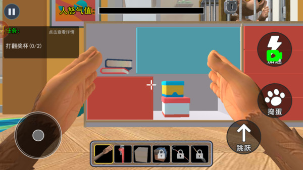 3、当奶奶出现时,立即停止捣蛋动作,利用房间内的角落或家具隐藏身形,待奶奶离开后再继续完成 “打翻奖杯” 任务。