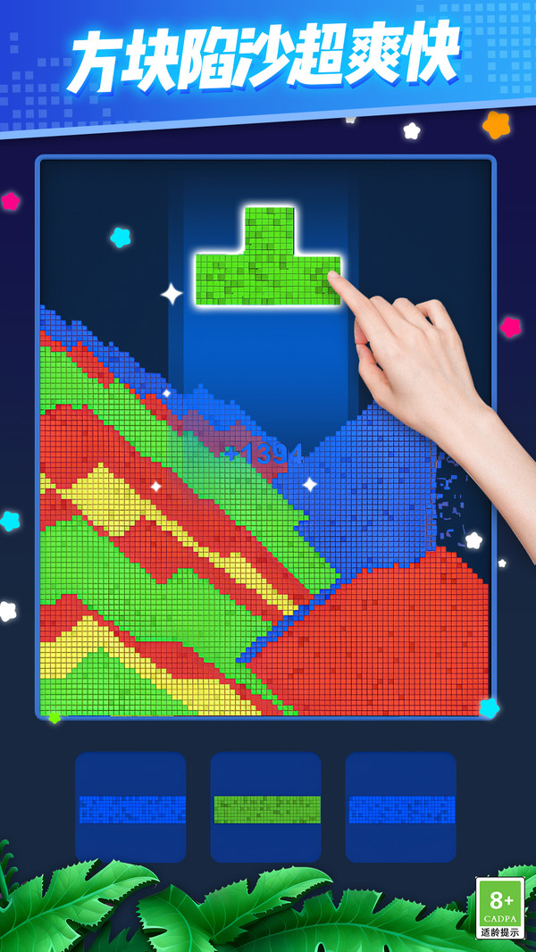 1. 本作采用细腻的粒子效果呈现流沙运动,每个沙粒的流动都会影响方块的下落路径与最终停靠位置。