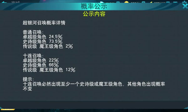 而超银河召唤奖励就比普通银河召唤奖励高了很多,在超银河召唤之中小伙伴们最高可以获得传说级和魔王级英雄,超银河召唤也是分为单次召唤和十连召唤两种,其中单次召唤传说级和魔王级获得几率是2%,十连召唤的传说级和魔王级召唤几率则变成12%,而十连召唤则会必然出现一个至少一个史诗级或魔王级英雄!无论是银河召唤还是超银河召唤都是拥有免费几率的,银河召唤每天可以召唤一次,超银河召唤则需要很长时间等待才能进行刷新!