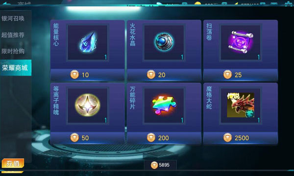 荣耀商城之中所有物品购买都是需要花费荣誉币,荣誉币可以通过竞技场等方式进行获取,在荣誉商城之中所出售的物品也是非常丰富的,其中主要出售的物品是能量核心、火花水晶、扫荡卷、等离子精魄、万能碎片、魔格大蛇,可以说是十分划算的存在