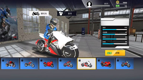 1、玩家进入游戏后可从车库挑选初始摩托车参与初级赛事,通过赢得比赛奖励金币用于购买性能更优越的机车或升级现有配件。