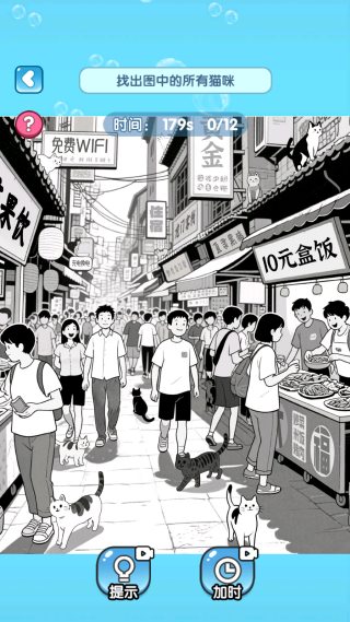 3、“夜市找猫咪” 关卡中,先扫视画面边缘(如屋顶、招牌)寻找隐蔽猫咪,再聚焦人群区域找显眼猫咪。