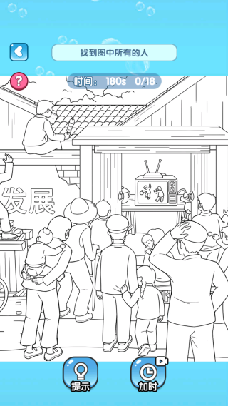 4、“怀旧蹭电视” 关卡需找齐 18 个人,先划分画面区域(如屋顶、人群、边缘),逐一排查每个区域的人物。