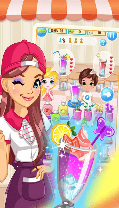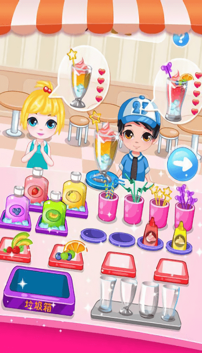1. 本作采用明亮活泼的卡通风格呈现饮料店场景,从操作台到装饰摆设每个细节都充满温馨氛围。