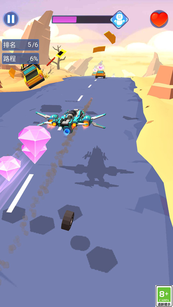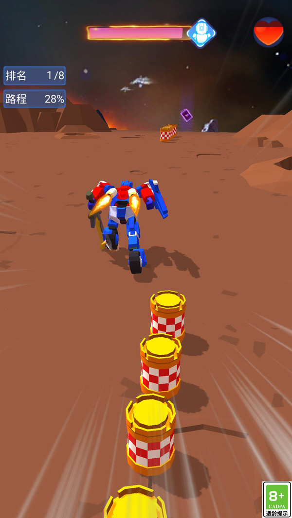 1、玩家驾驶可变形机器人在赛道上极速前进,同时运用战术变形和武器攻击对手,躲避障碍并收集奖励。