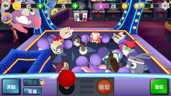 2.投币之后点击画面下方的红色摇杆来控制娃娃机机械臂的移动,将机械爪子停留在你想要的娃娃上,然后点击抓取。