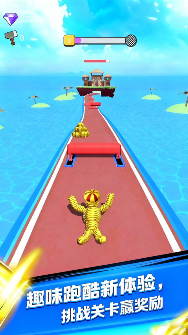 2、持续收集跑道上的彩色线团,让角色体型不断增大,遇到红色障碍物时,利用增大的体型直接冲撞破坏。