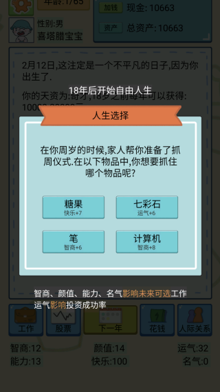 1.游戏开始前从逻辑、魅力、体能等维度选择先天优势,天赋直接影响初期资源获取效率与关键事件成功率,为后续发展奠定基调。