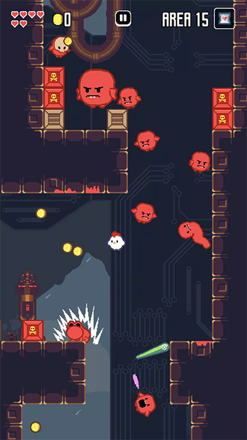 这部作品玩起来显得非常的有趣,玩家能通过点击的方式在挑战中操作手机左右两侧控制游戏中的角色跳跃,还要撞击不同的敌人在画面中消灭它们,在此过程中的你需要时时刻刻注意躲避攻击,拥有程序化生成的无限关卡。