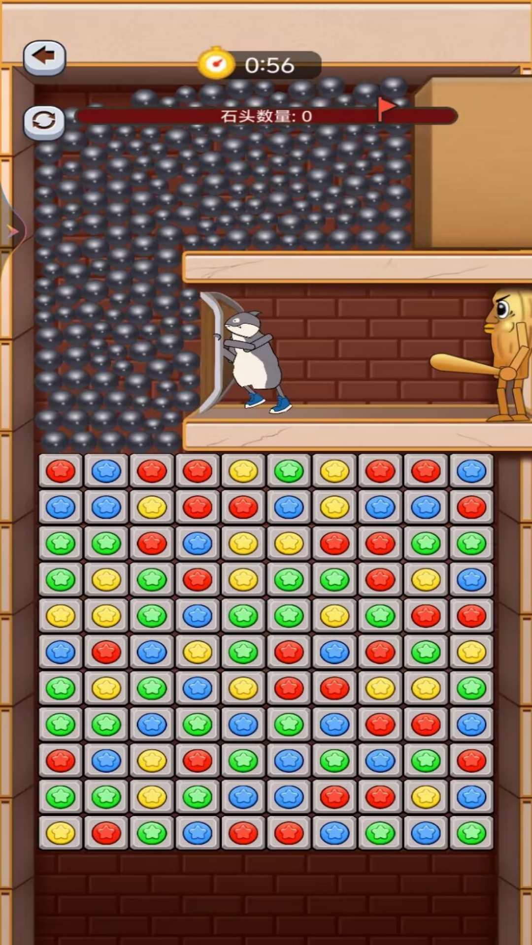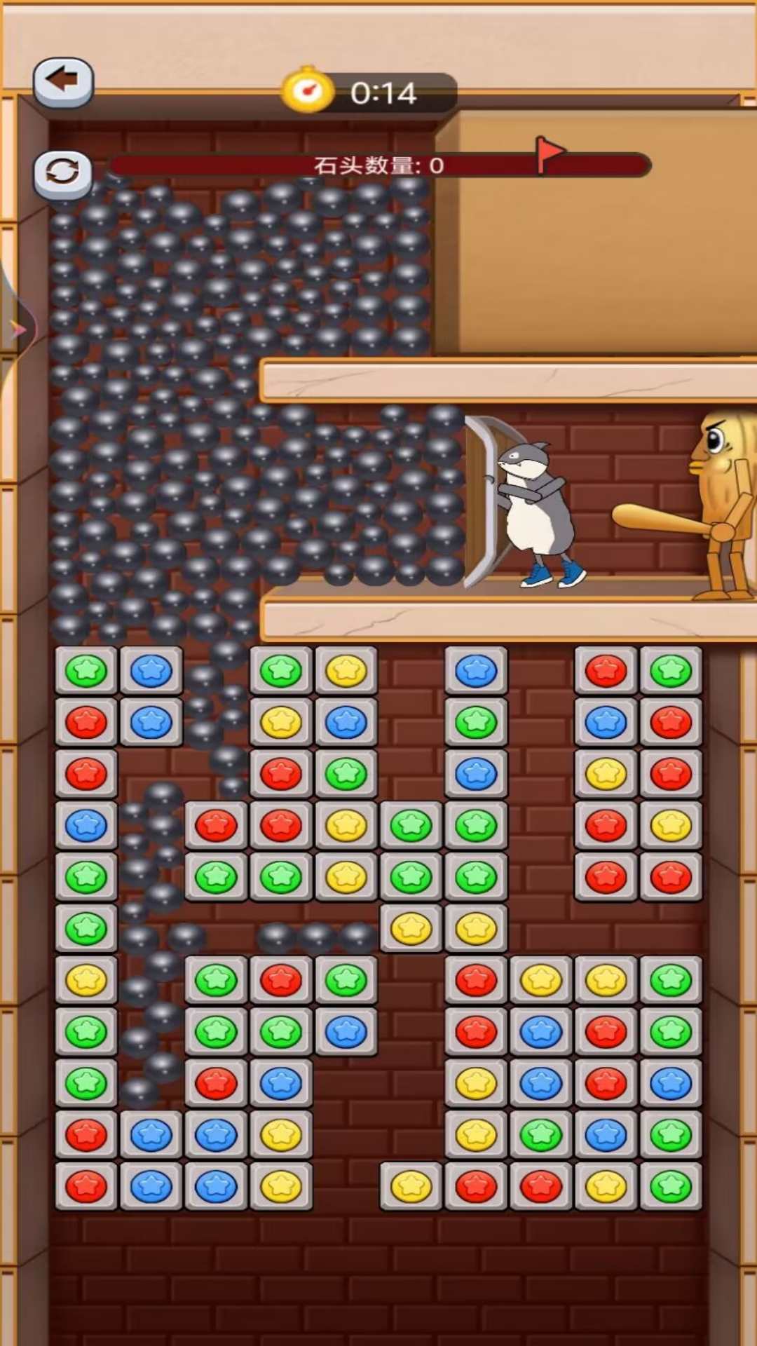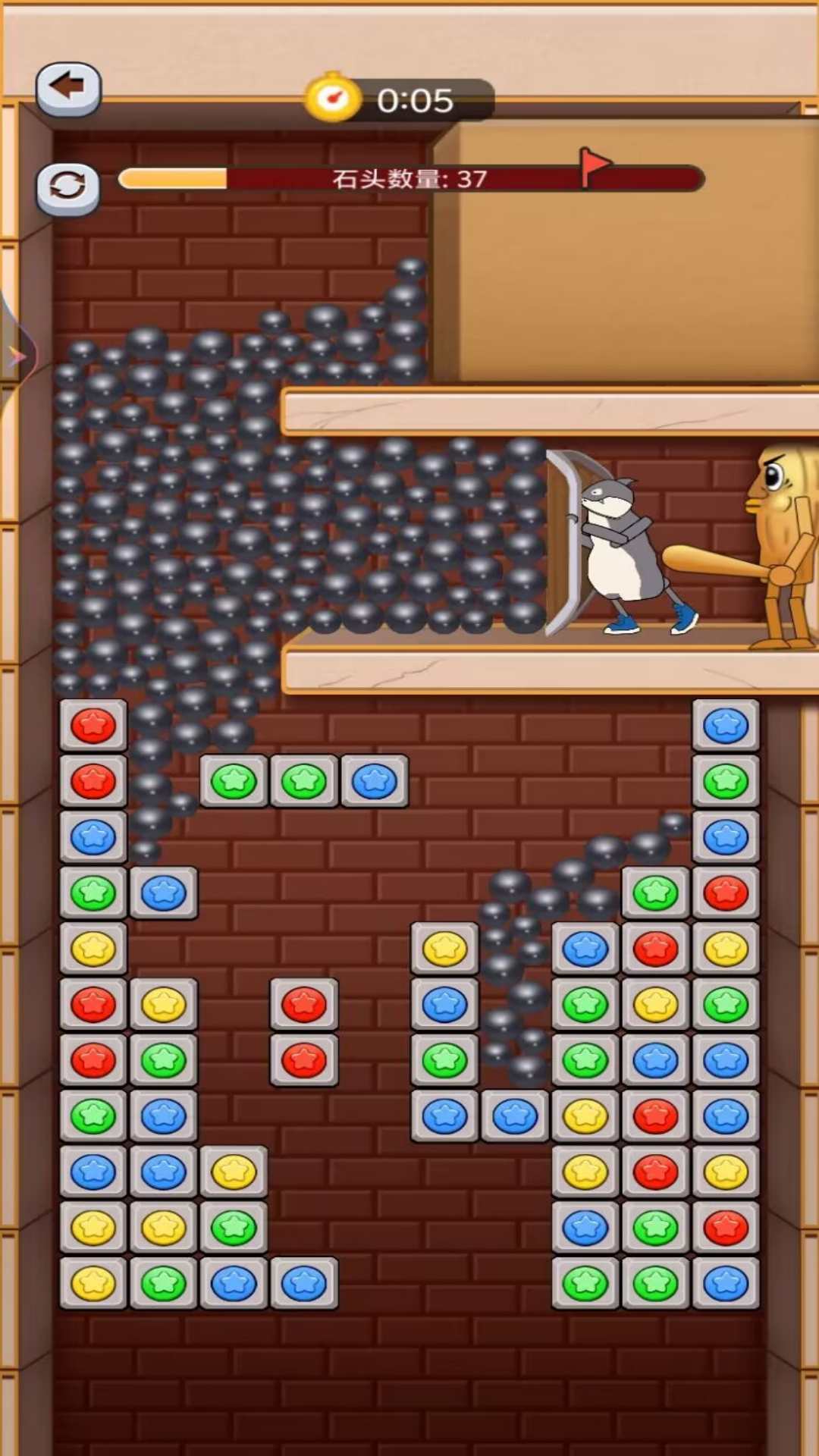 2.不断卸下来的钢珠正在推着鲨鱼人后退到木棍人处,我们的任务就是要消除下方的方块来拯救鲨鱼人。