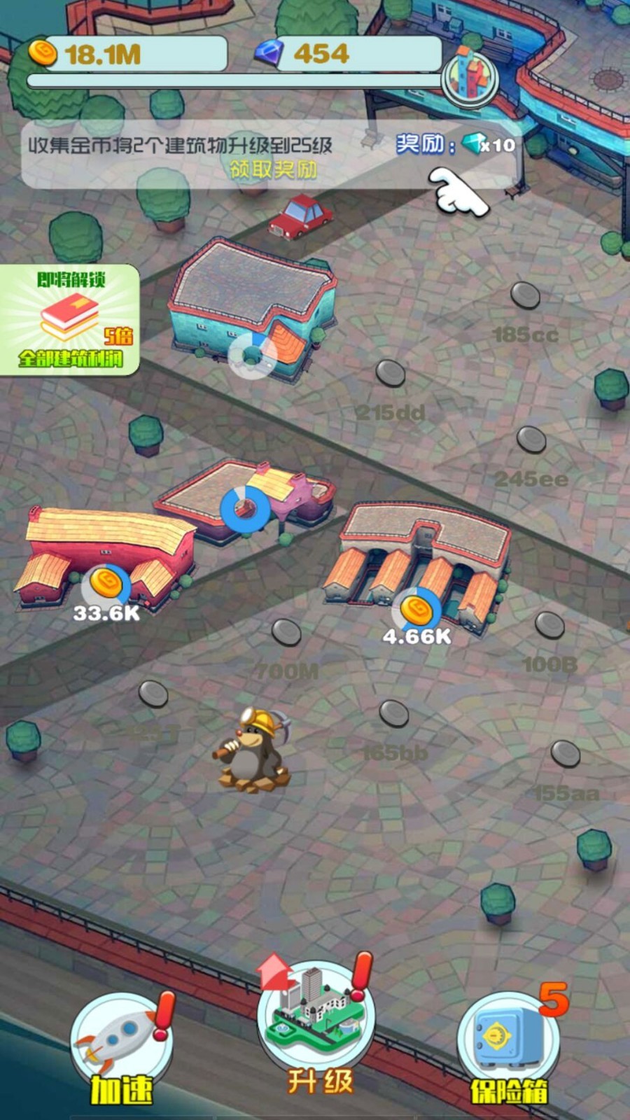 2.收集的金币用于升级建筑与解锁新设施。随着等级提升,单栋建筑收益大幅增长,玩家可以利用金币进一步建造城市建筑。