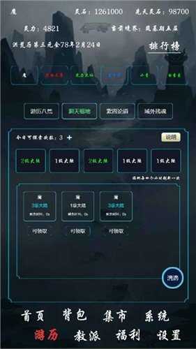 来源:游历-游历八荒-游历地星;洞天福地;紫霄论道;三十六重天;点数转换;洪荒寻宝。