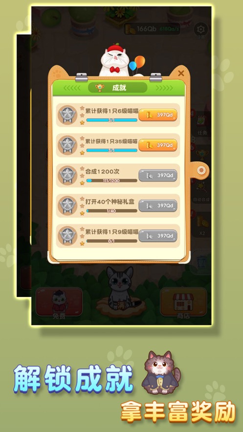 1、收集合成系统:通过合成不同猫咪提升等级,解锁更多可爱外形与互动方式;