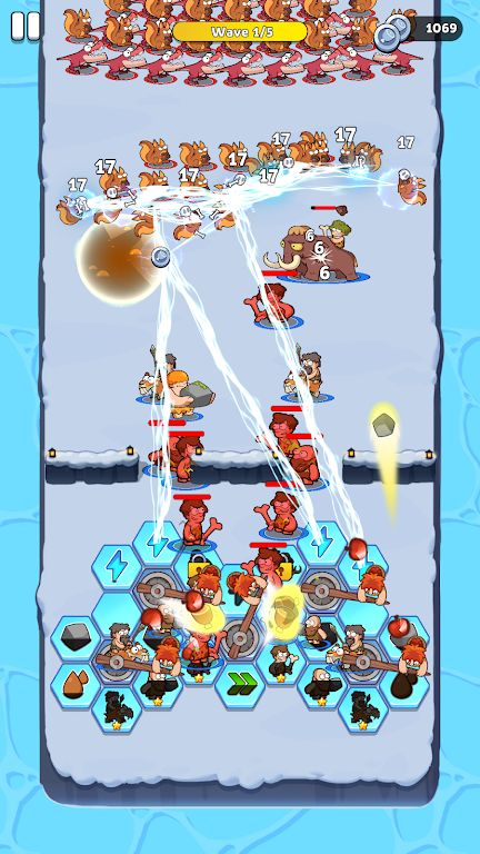 1、从石器时代开始防御作战,召集原始人组成基础队伍,阻挡敌人来袭,成功防守进入下一关。