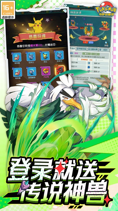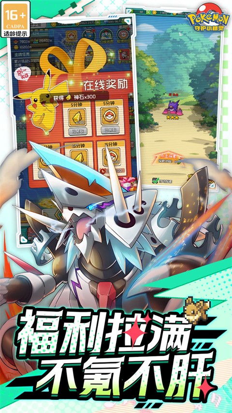 【培养】回合制限四招对战玩法,精灵mega进化、极巨化、神兽融合、限时狩猎等创新玩法。