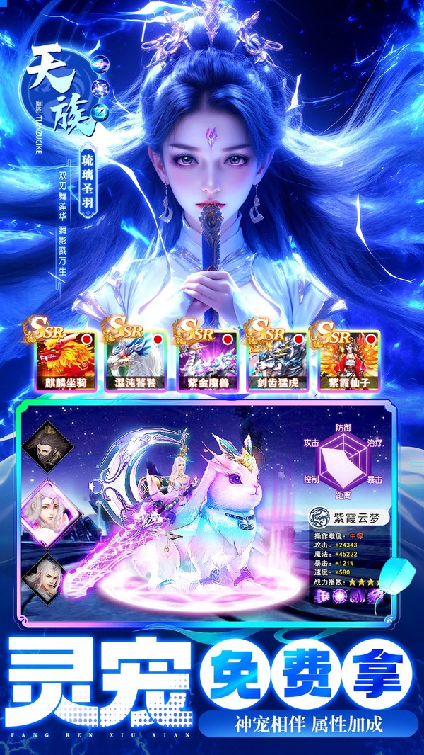 3、激萌仙宠阵容、华丽飞羽、炫酷坐骑、无双神兵,呆萌角色随心切换,为玩家创造美轮美奂的战斗体验;