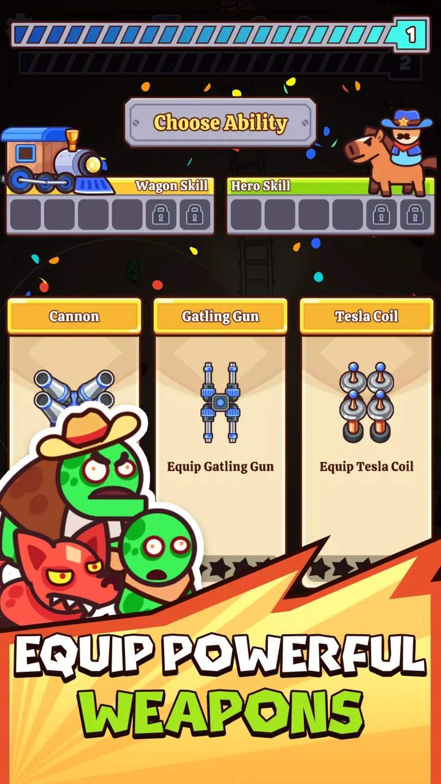 1、操控牛仔角色,借助火车或自身攻击,清理周围绿色小怪,把握攻击节奏,推进游戏进度。