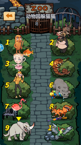 1、以动物园癫狂动物出逃为背景,玩家需利用场景道具隐藏身形,躲避动物追捕,主打紧张刺激的躲猫猫体验。