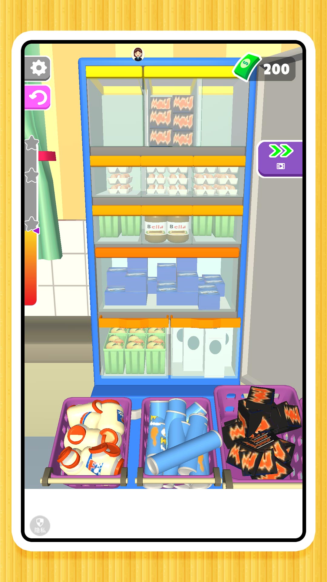 2、物品需完全放入收纳空间且不超出边界,部分关卡要求物品摆放整齐方向一致,达到指定精度才算完成。