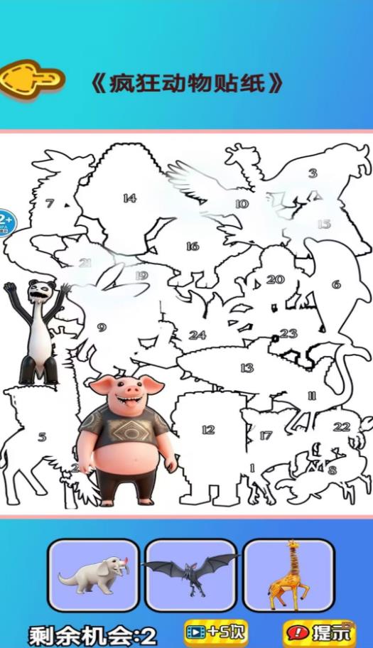 2、贴纸玩法里根据场景需求,将下方依次出现的三种动物贴纸,放置到合适位置达成关卡要求。
